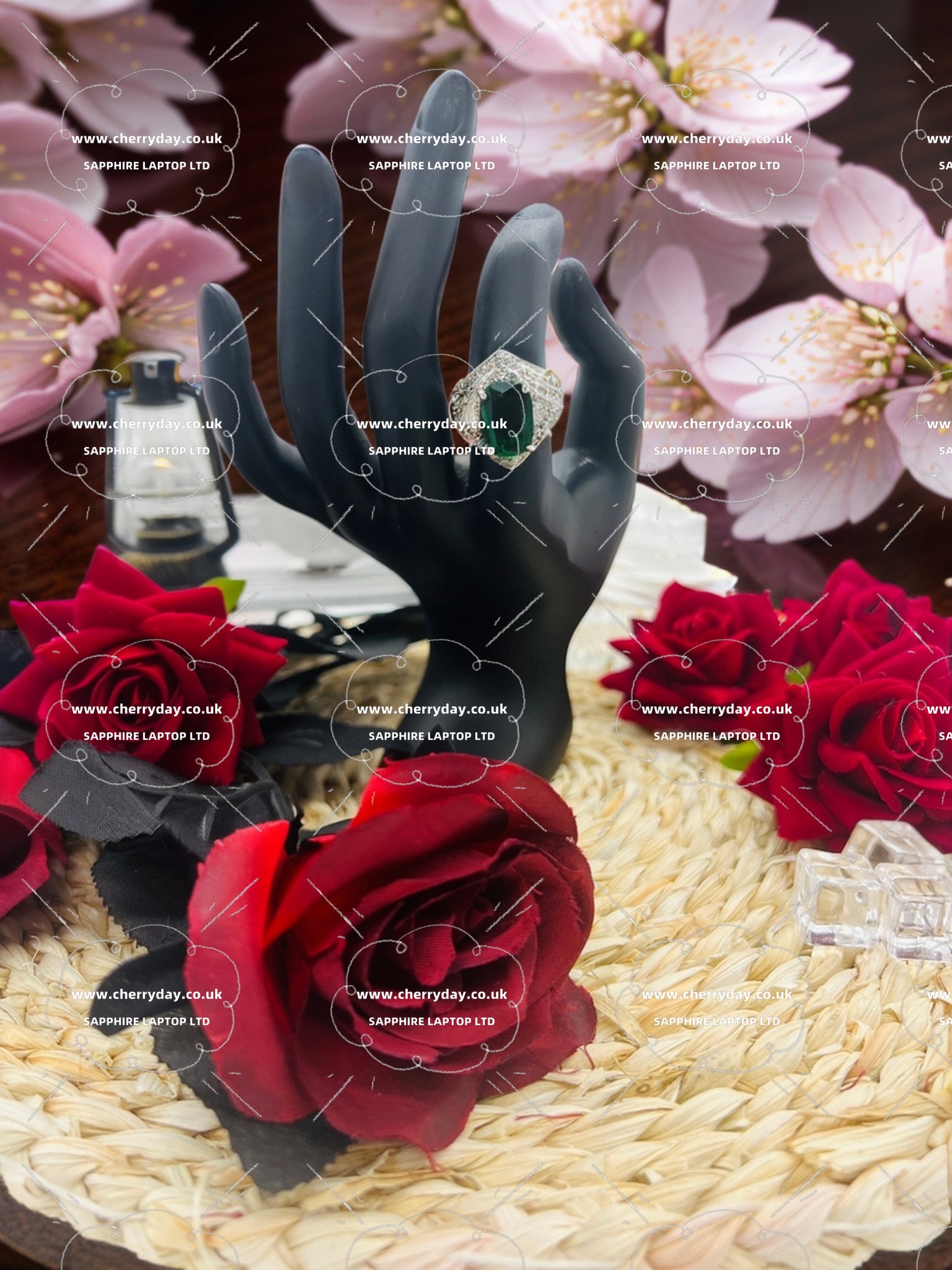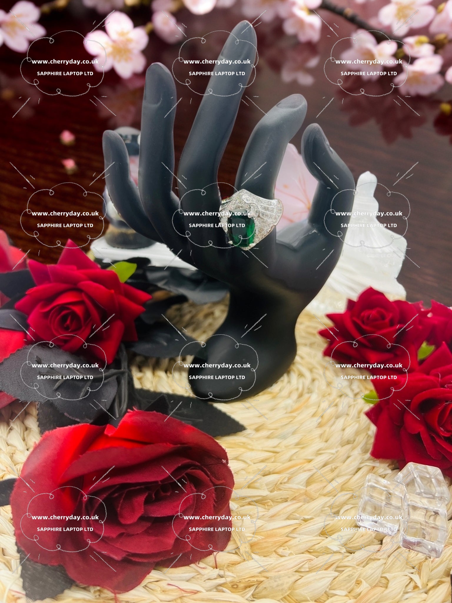 This emerald prism ring is fit for royalty. With a large, sparkling green gemstone surrounded by silver diamonds, it exudes elegance and luxury. The perfect piece to make any outfit feel regal and extravagant.