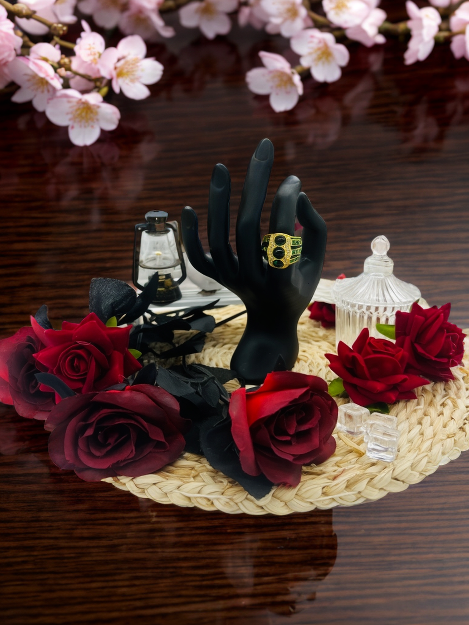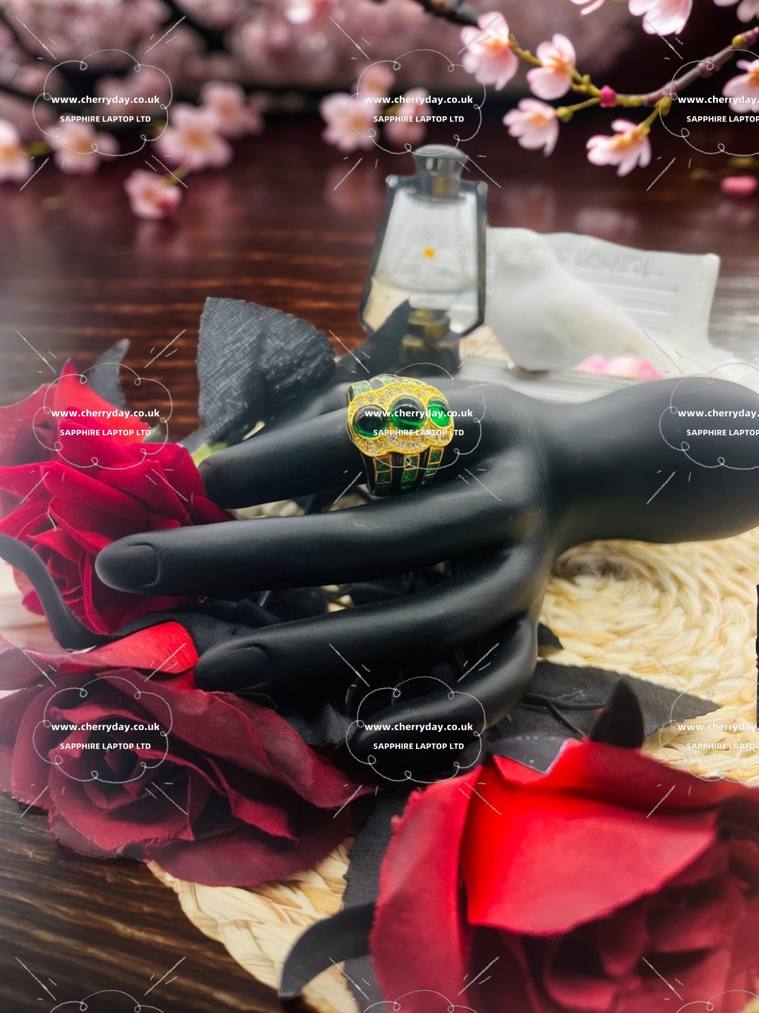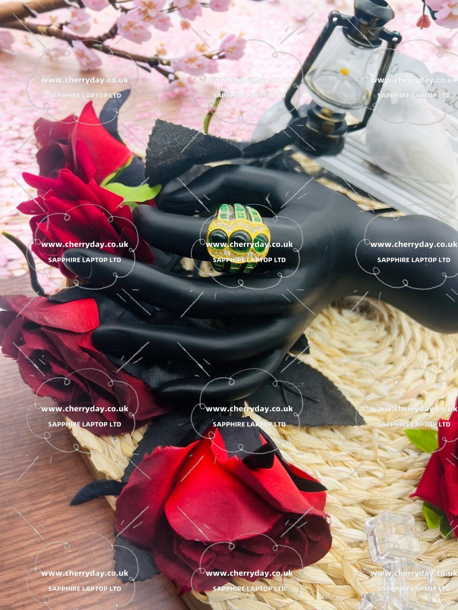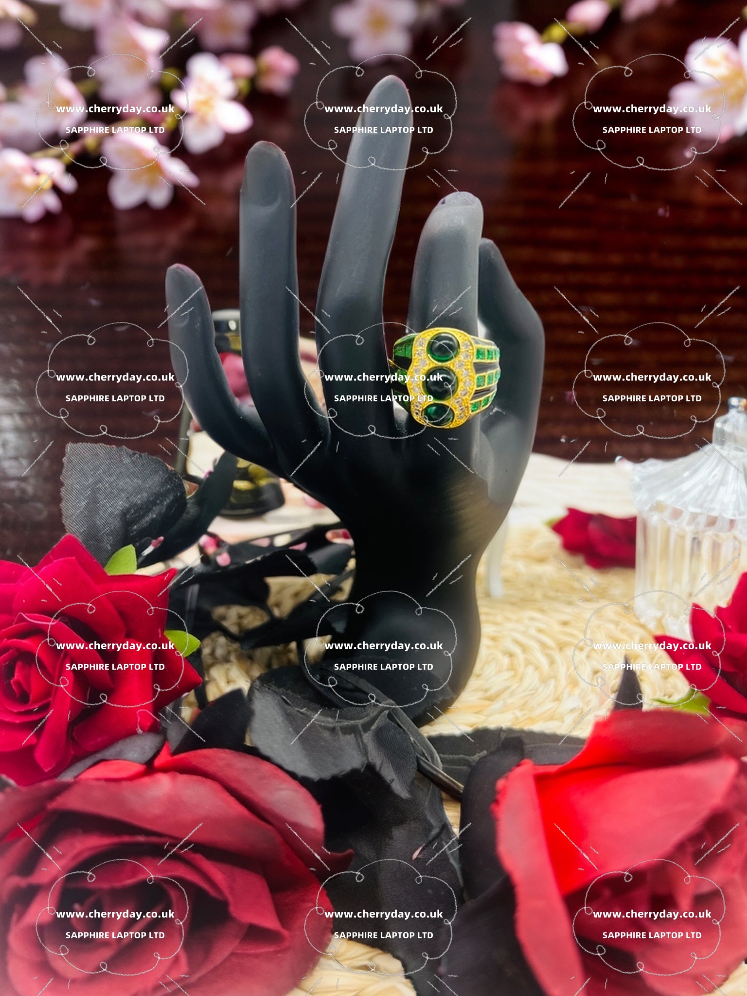 Inspired by royalty, this triple layered gold ring boasts a crown-like band adorned with luscious emeralds. Exude luxury and glamour with this unique and regal accessory.