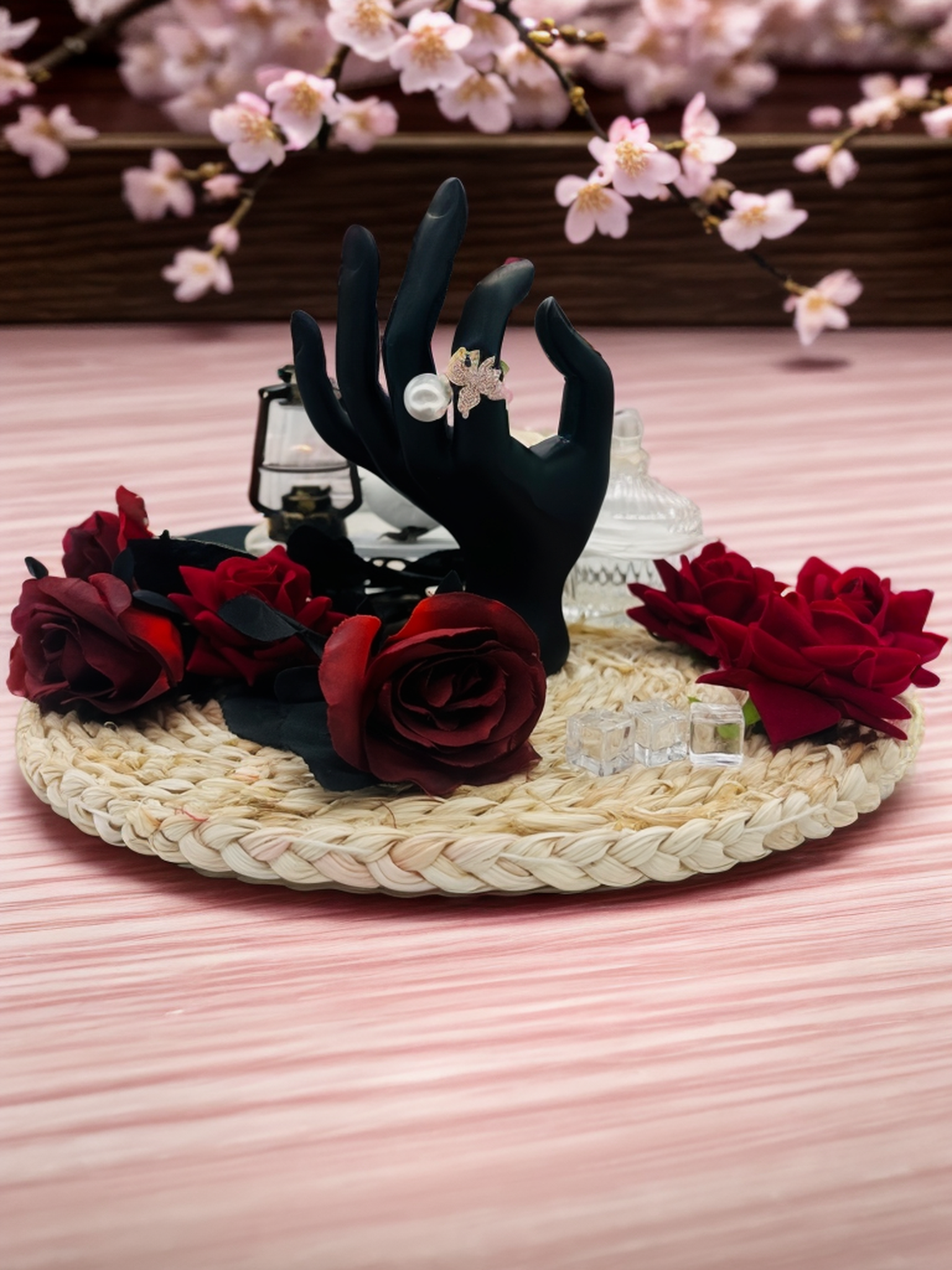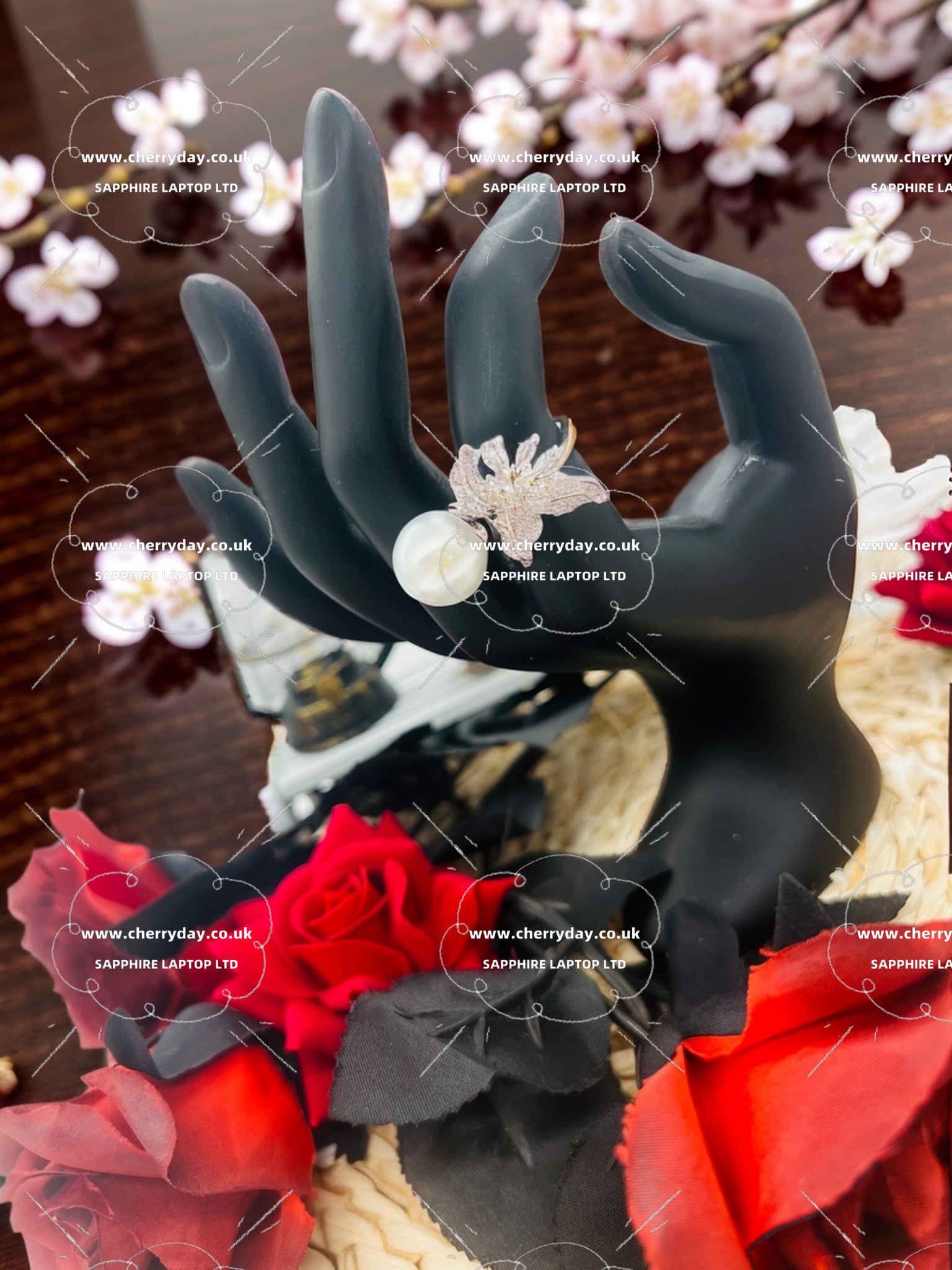 Bring a touch of whimsy to your look with our Eternal flower pearl ring. Its unique asymmetrical design features a playful mix of silver diamonds and white pearls, evoking the beauty of a pearl bush. Add a touch of charm to any outfit with this quirky ring.