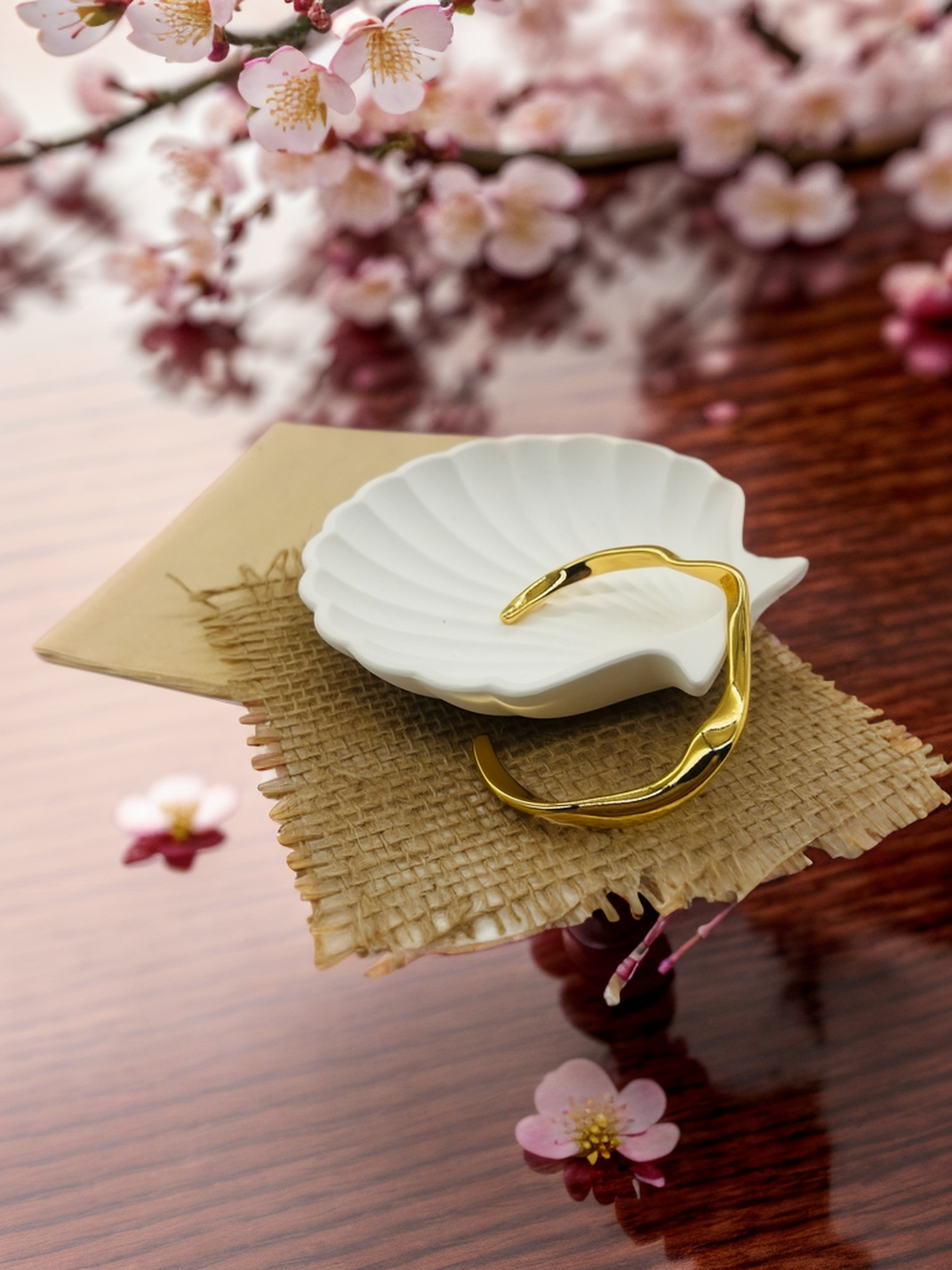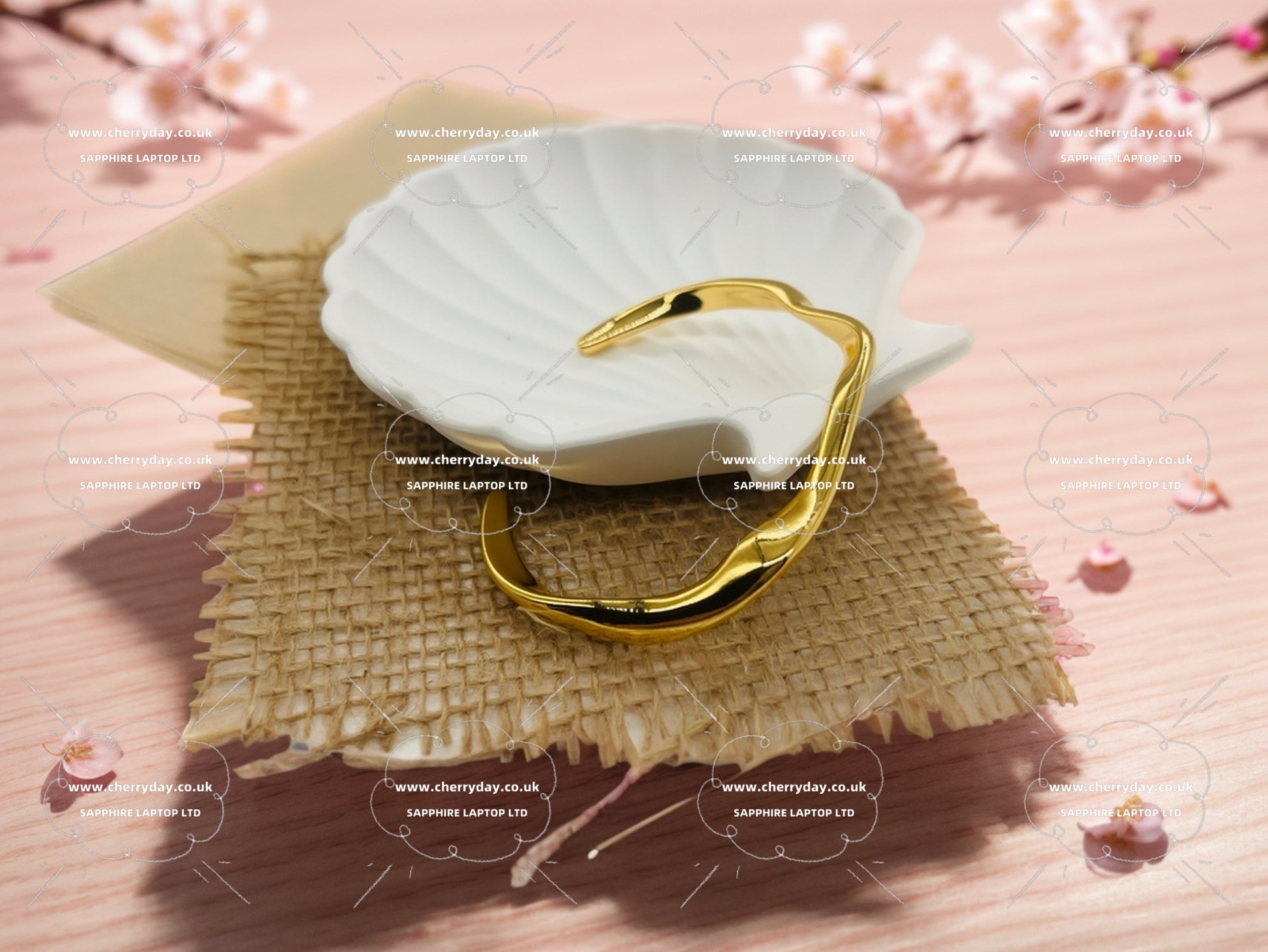 Indulge in the luxurious elegance of our Gold Streamline Bracelet. Made of gold-coloured metal, it boasts a linear structure with a unique wave pattern inspired by the free extension of ideas and the art of writing. Elevate any outfit with this sophisticated and exclusive piece.