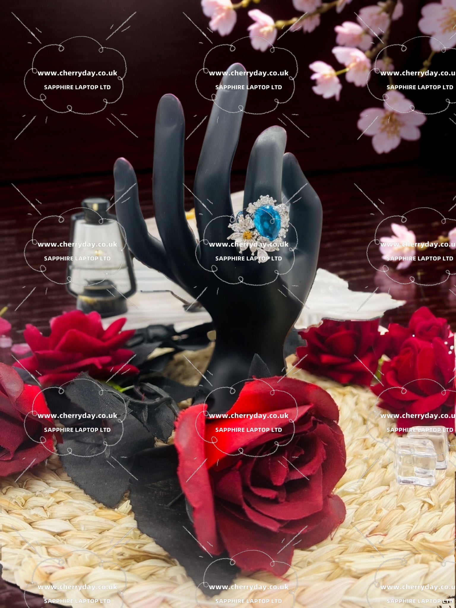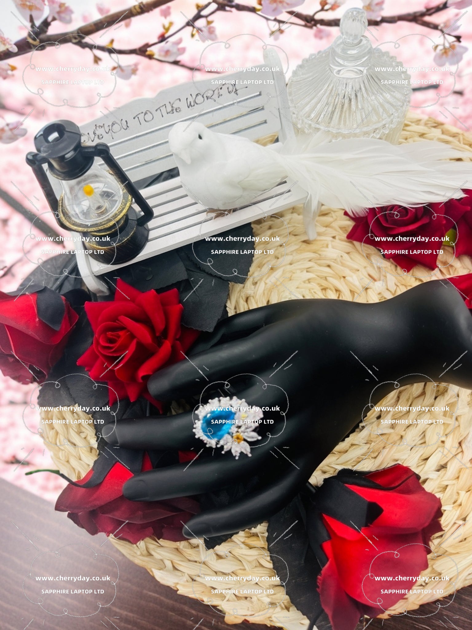 Elegance and grace combine in our Sapphire half-daisy ring. The lake sapphire centre stone is adorned with silver diamond leaves, creating a poetic floral design. Feel extra noble and charming with this hidden gemstone ring. Indulge in timeless elegance with our Sapphire half-daisy ring. The stunning lake sapphire centre stone is surrounded by delicate silver diamond leaves, embodying a poetic floral design. With this enchanting hidden gemstone ring, you'll feel effortlessly sophisticated and captivating.