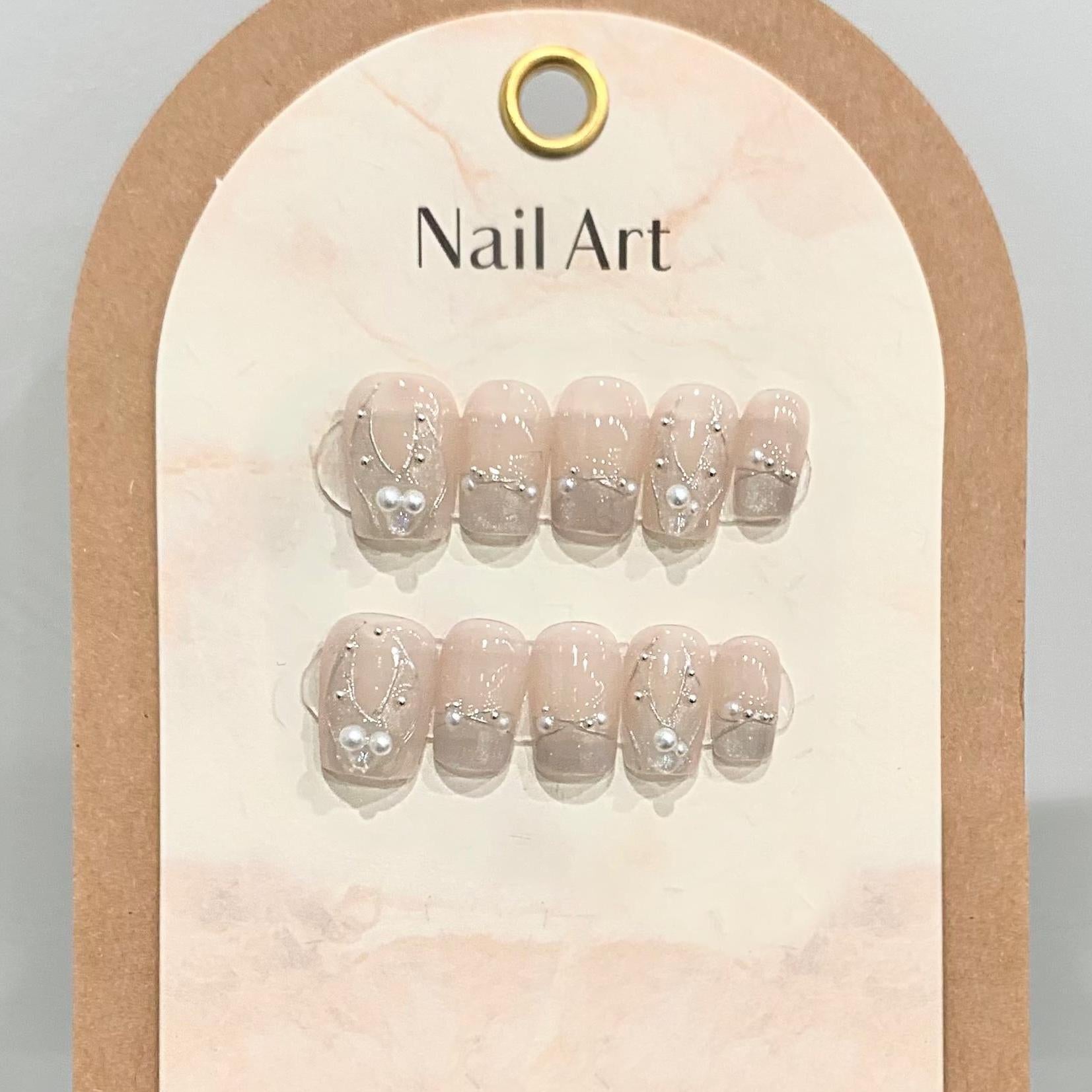Nails 022-Mermaid Pearls French Cat Eye Hand-Painted Nail Art