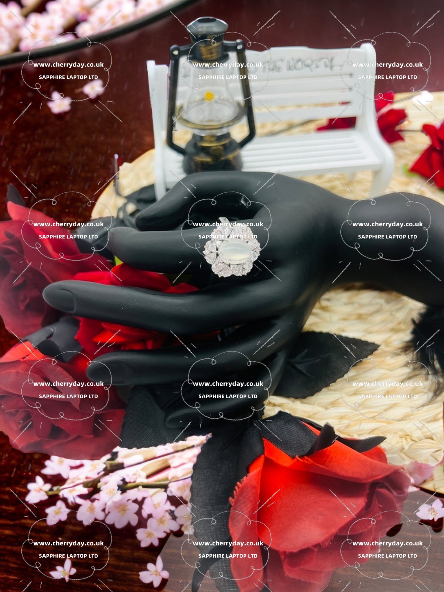 Embrace your inner goddess with the Moonlight flower ring. Crafted from the finest white moonstone, its delicate petals are adorned with sparkling silver diamonds. This divine design exudes a noble elegance, perfect for those who want to radiate elegance and grace like the goddess of moonlight herself!