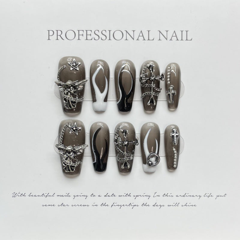 Ignite your style with these edgy press-on nails featuring a bold black and white design with fiery mandarin flames and metallic accents. Perfect for making a statement, these eye-catching nails bring the heat to any outfit. Rock them at concerts, nights out, or whenever you're feeling fierce!