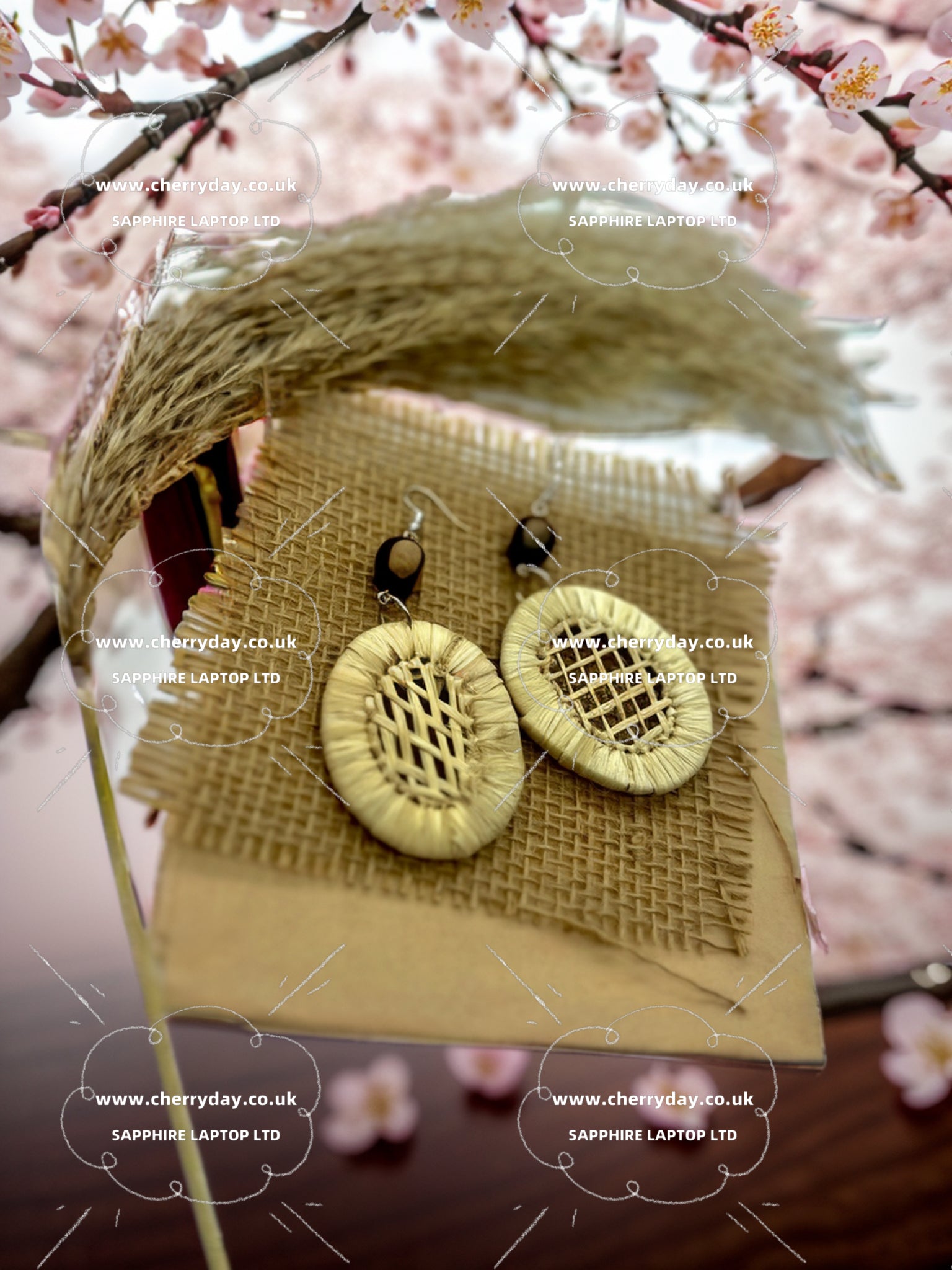 Crafted from white reed grass, these earrings feature a straw mat design with an oval shape, adding a touch of bohemian charm to your style.
