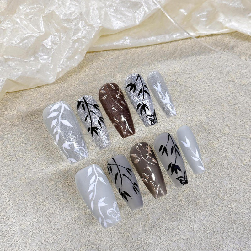 Flutter into fabulous with our Hand Painted Butterfly Bamboo Nail Art! These whimsical designs feature dainty butterflies dancing among elegant bamboo stalks, bringing a touch of nature's playground right to your fingertips. Each nail tells a tiny story of freedom and fun – perfect for turning everyday hands into conversation-starting masterpieces!