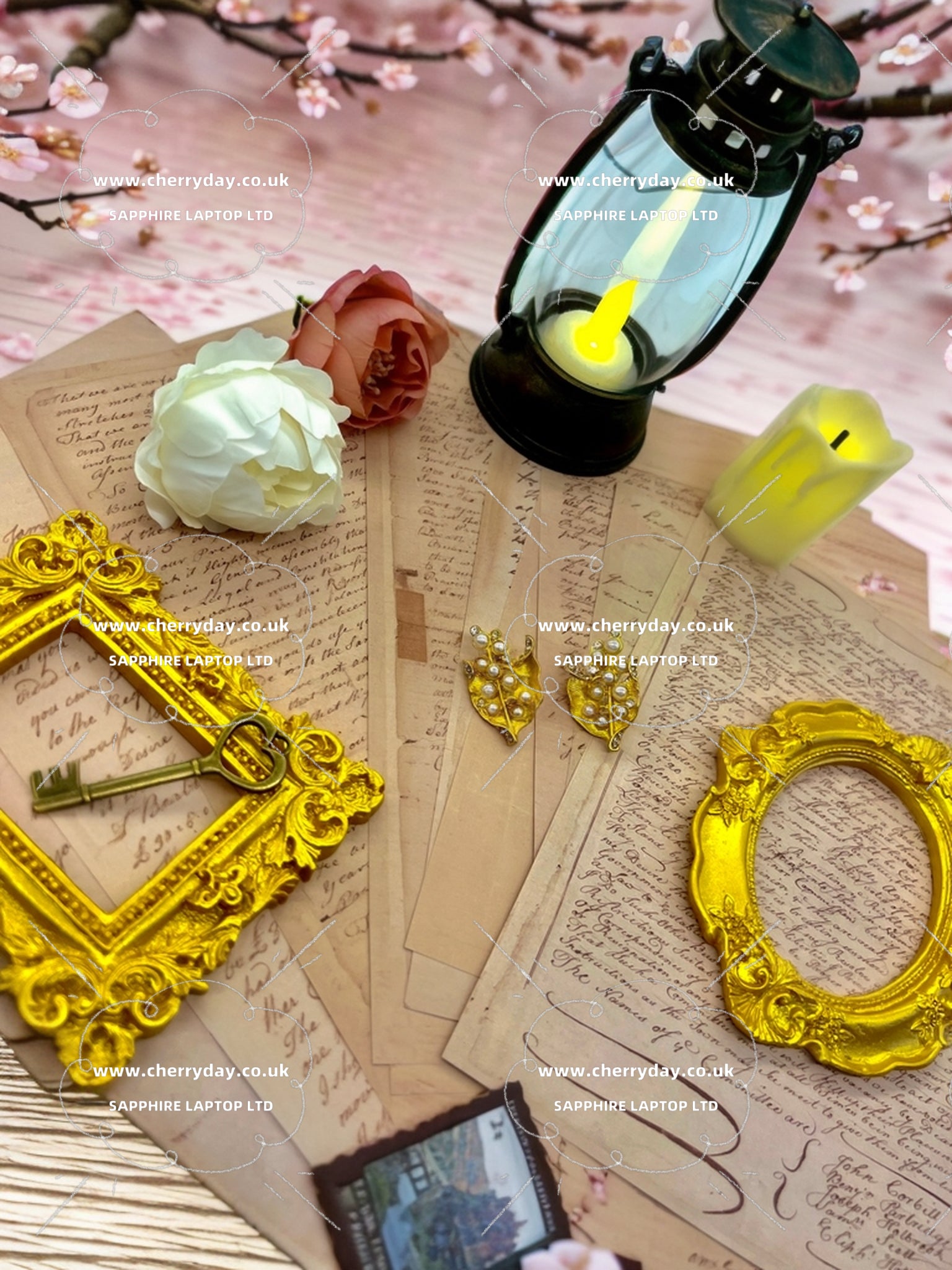 These vintage earrings feature delicately inlaid gold leaves, accentuated with shimmering pearl particles. The elegant graphic design adds a poetic touch to any outfit. An exquisite addition to your collection that exudes sophistication and charm.