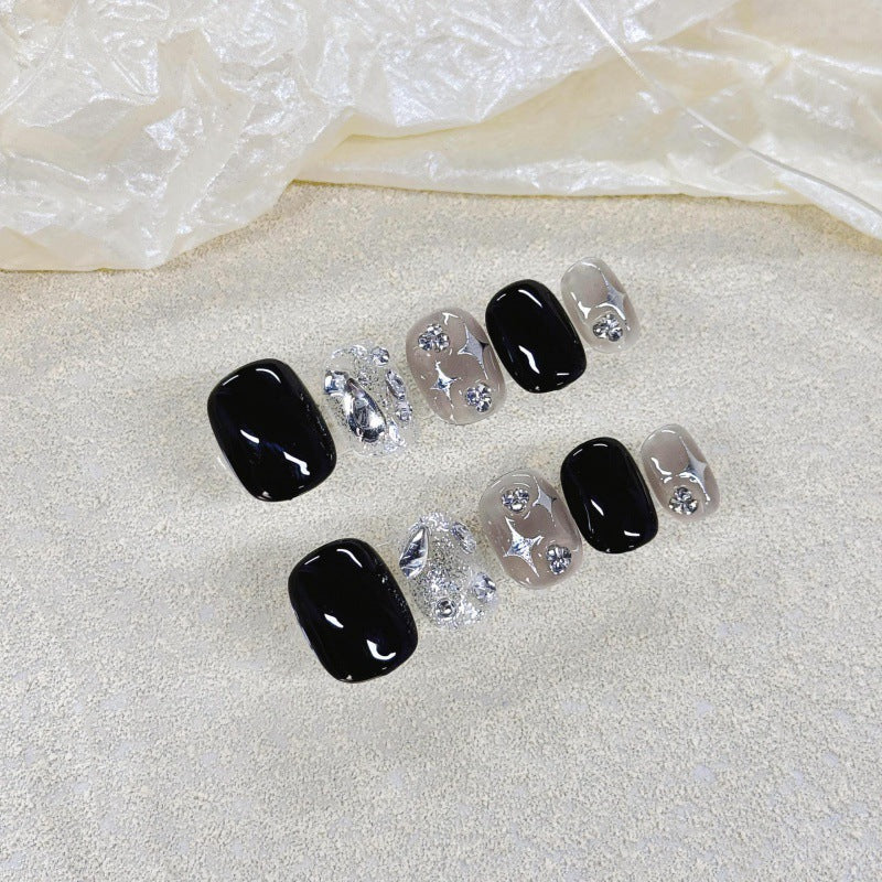 Nails 073-Black Burst Glitter Diamond Quadrangle Halo Short Manicure
